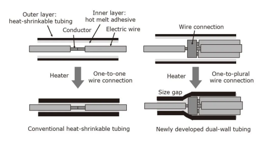 咱们开发了可用于维护一对多的轿车线束衔接的双壁管。当加热到相对较低的温度(135°C)时,新管契合导线衔接的不规则外形。别的,该管不会引起粘合剂的流出或引起方位偏移,而且在125℃的运用环境下表现出高机械特性。因为其优异的热缩短性和密封功能,新管材有望在轿车范畴得到广泛运用。