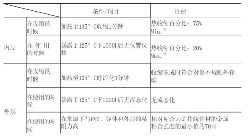 为了避免PVC线在热缩短进程中发生热降解,有必要将进程温度控制在100°C或更低。为了满意上述要求,咱们在自动缩短机中测量了最大加热温度和时刻,发现可以将管道加热到135°C继续一分钟。将管道加热到此温度时,其外层有必要完全缩短,而内层则需求活动并契合被遮盖对象的不规则外部概括。另一方面,在125°C的运用温度下,要求管道显现出恰当的绝缘和密封功能,一起又不使管道和粘合剂位移。表2和表3别离显现了用于新管的资料的开发方针及其方针特性。