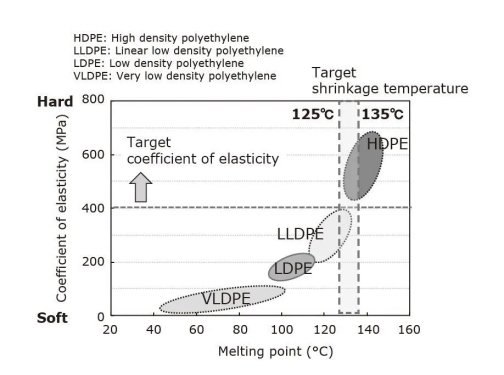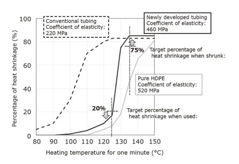 为了消除这些缺点,咱们将聚合物掺入聚乙烯中以优化其熔点。成果,咱们开发了一种新的根据聚乙烯的外层资料。新资料在加热到135°一分钟后会缩短(热缩短率:75%或更高),但在125°C的运用温度下不会缩短(热缩短率:20%或更低)或移位(图6)。