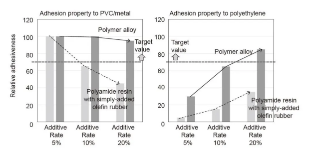 金满地45451cc 图9.聚酰胺树脂与简单添加的烯烃橡胶和聚合物合金之间的粘合力差异