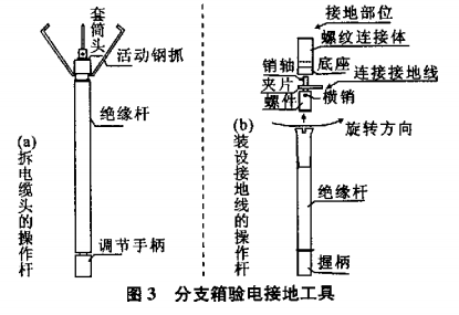 (3) 装设接地线的操作杆(见图3b)它与其它广家设计不同,采用带磁性的接地装置(其接地线三相一组),可使人在安全活动范围内不用直接接触分支箱,不用去除金属双头螺杆即可直接装设接地线,更加方便安全。使用方法为:a)先接接地端,后接导体端。接地装置部分与绝缘操作部分通过磁性吸住,旋转操作棒,横销对应卡口可卡住并带动旋转接地装置。b)将螺纹连接体(其螺纹标准按现有多数电缆分支箱双头螺杆的2种尺寸而定)套在电缆分支箱双头螺杆上,旋转绝缘杅将其拧紧,即接地装置前端接好。c)推绝缘杆使弹簧收缩旋转一角度,使销轴脱出底座槽口,接地线后端螺纹开始受力。旋转绝缘杆,使夹片与螺纹连接体和螺件紧密接触,即接地装置后端安装牢固。d拔出绝缘杆重复操作将三相全部接好,即接地线装设完毕。