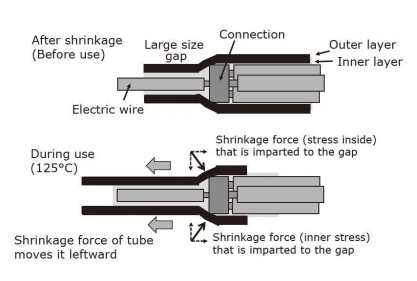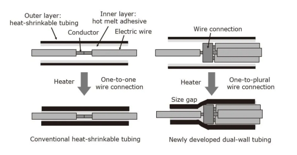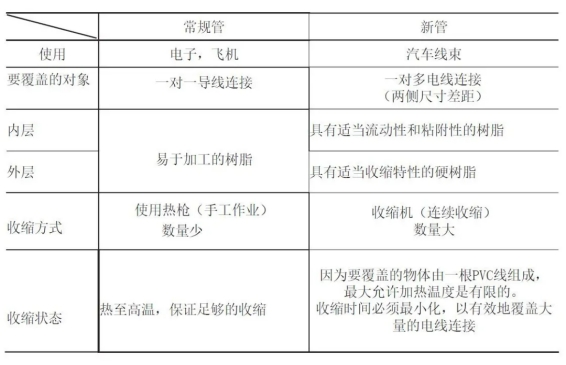 一般,传统的双壁管用于维护1对1的电线联接。可以毫无困难地用热空气或其他加热设备(250-350°C)将管道缩短。另一方面,为了维护轿车线束的联接,需求满足以下四个特定条件: