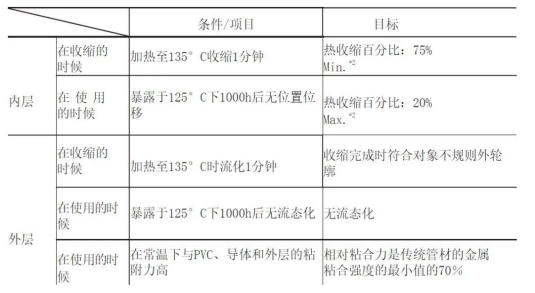 金满地45451cc 为了防止PVC线在热缩短进程中发生热降解,有必要将进程温度操控在100°C或更低。为了满足上述要求,咱们在主动缩短机中测量了最大加热温度和时刻,发现可以将管道加热到135°C继续一分钟。将管道加热到此温度时,其外层有必要完全缩短,而内层则需求活动并契合被隐瞒方针的不规则外部概括。另一方面,在125°C的运用温度下,要求管道显现出恰当的绝缘和密封功用,一起又不使管道和粘合剂位移。表2和表3分别显现了用于新管的资料的开发方针及其方针特性。