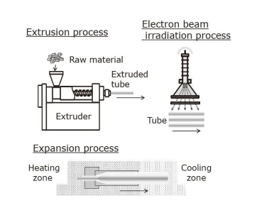 金满地45451cc 热缩套管的制作进程如图2所示。如图所示,制作进程包括三个步骤:揉捏,电子束*3辐照和胀大。在揉捏进程中,树脂被揉捏成管状。在电子束辐照进程中,管子是交联的。在胀大进程中,经过加热使交联的管子软化,然后施加内部压力以使管沿径向胀大。终究,将管冷却并固化为热缩套管。