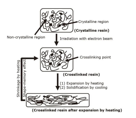 热缩短管在受热时缩短的原理如图3所示。当电子束传输到由结晶区和非结晶区组成的结晶树脂*4时,树脂分子在非晶区域互相联接。作用,树脂转变为具有在非晶区域中构成的交联点的交联树脂。经过加热使交联树脂胀大,然后冷却并固化为热胀大的交联树脂。当将热胀大的交联树脂加热到等于或高于晶体区域的熔点的温度时,晶体熔化并变软。作用,因为存在交联点,树脂缩短成胀大前的形状(形状回忆效应)。(1)