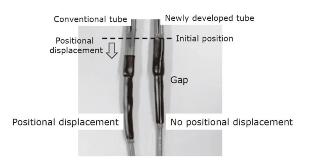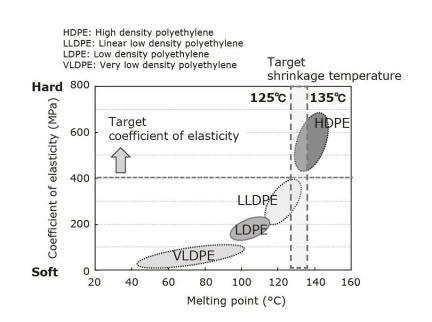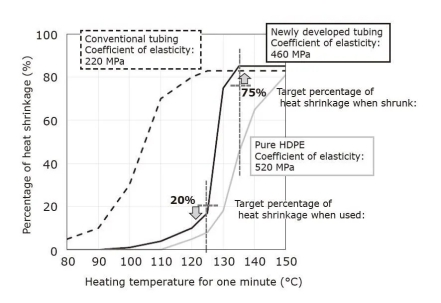 因为高密度聚乙烯(HDPE)*5的弹性系数高于其他类型的聚乙烯,因此有望供应高机械强度。但是,发现HDPE在加热到135℃(略低于其熔点的温度)一分钟时不能充分缩短。相反,其他类型的聚乙烯在加热到125°C时会缩短,但在125°C的运用温度下会软化,然后在径向方向上发生内应力并滑出其预期方位(图5)。